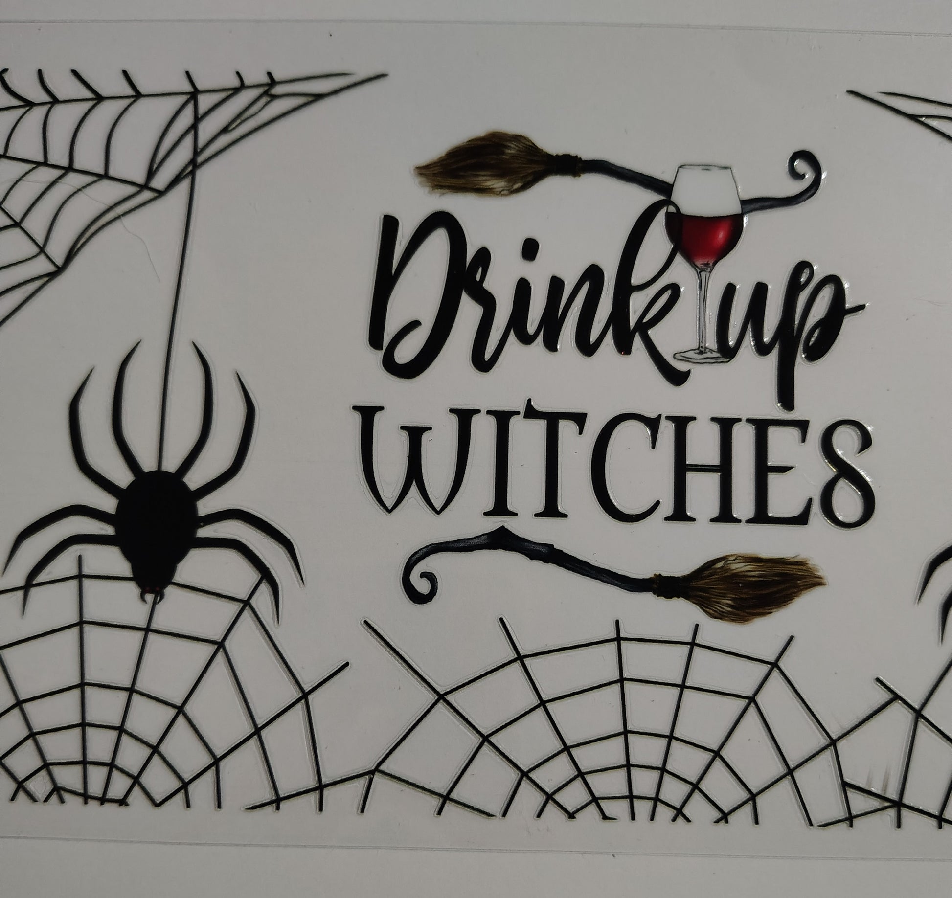 Cute witchy cup wrap, surrounded by spider webs and brooms.